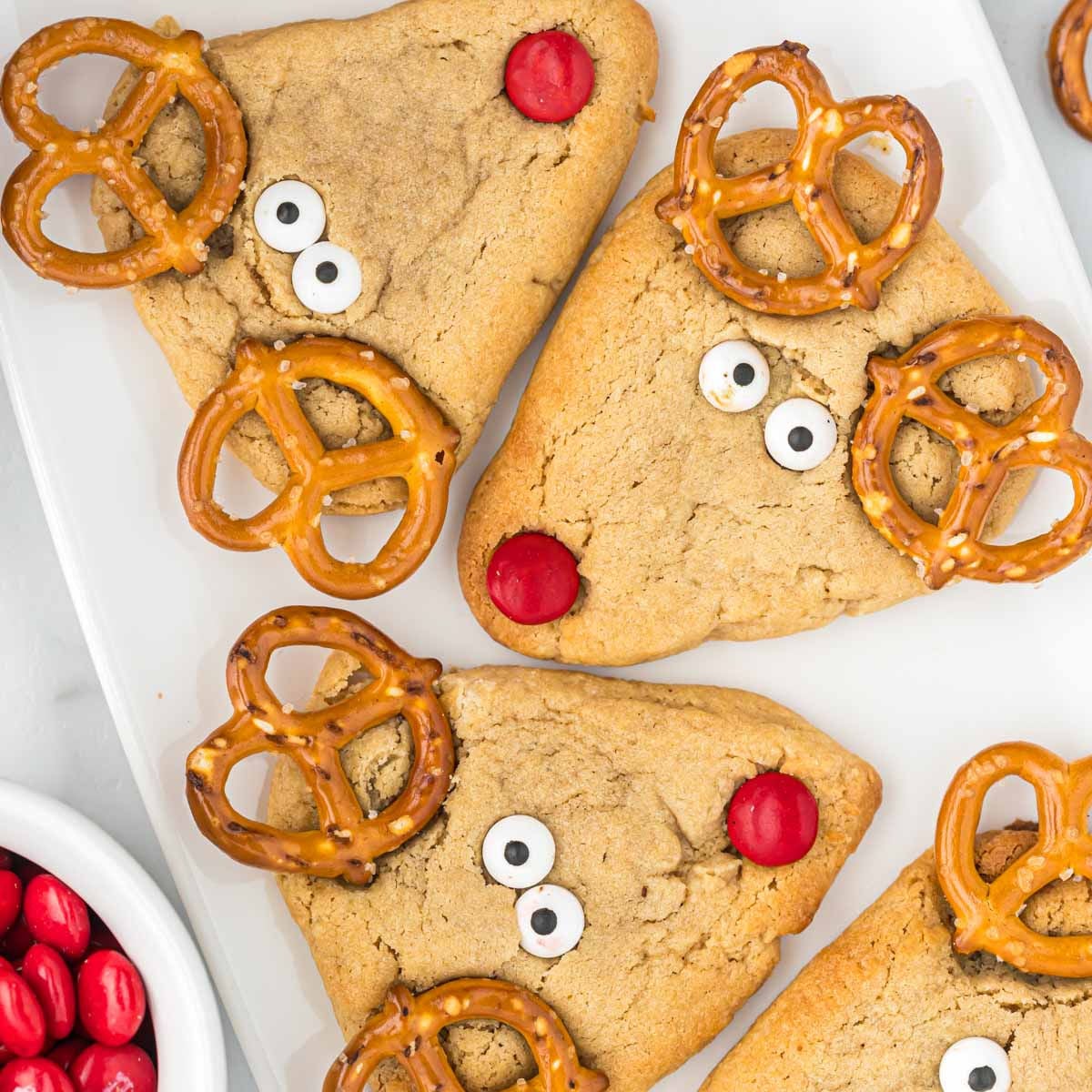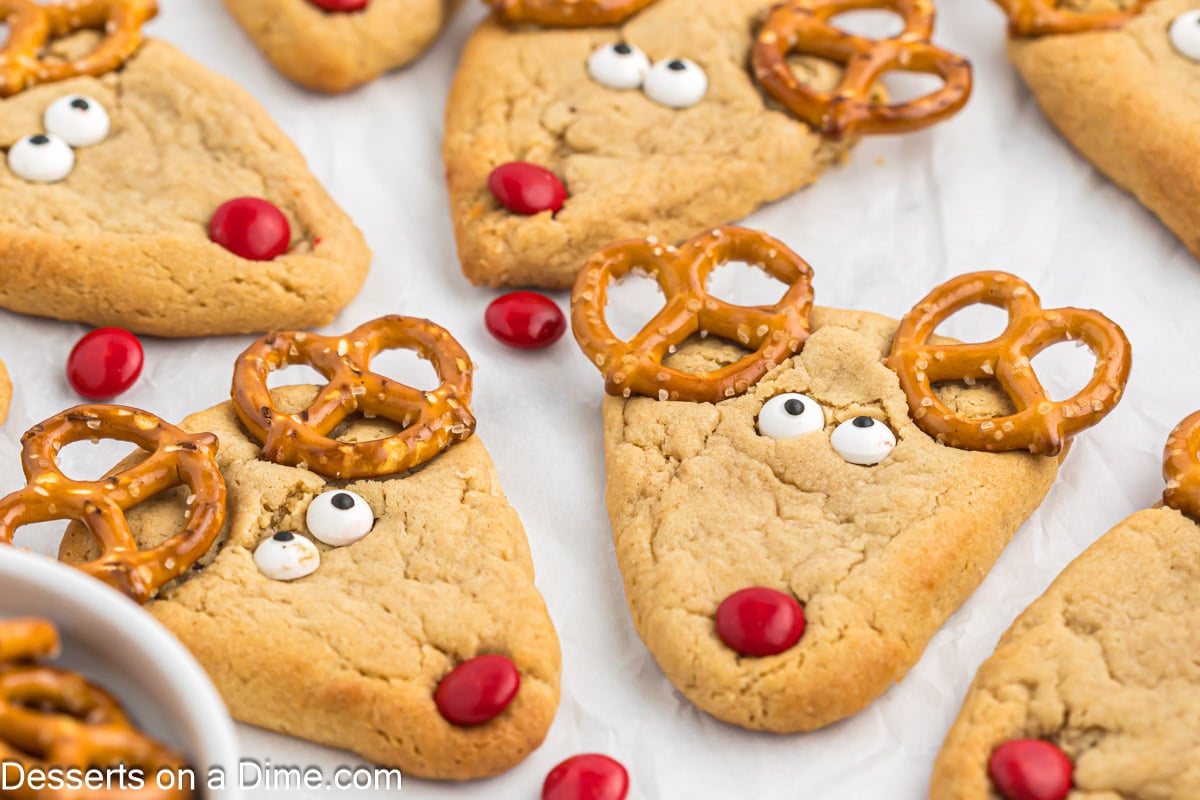Festive Reindeer Cookies made with soft peanut butter dough, pretzel antlers, and candy eyes. A fun holiday treat for parties.