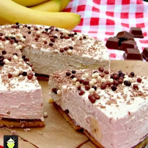 This recipe has a chocolate chip cookie base with rich peanut butter and banana filling. It has a melting chocolate layer that spreads smoothly throughout the cake.