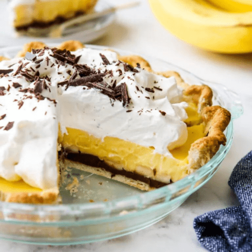 This creamy chocolate banana pie has layers of fresh bananas, vanilla pudding, and chocolate ganache.
