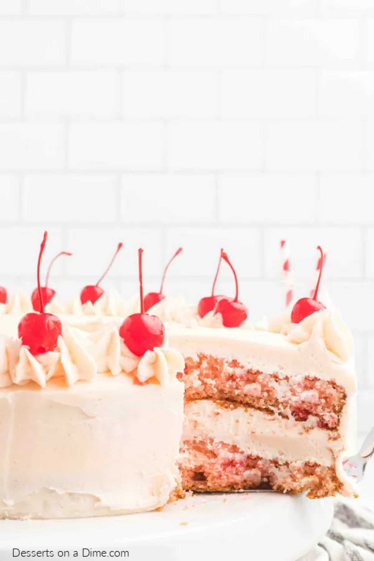 The dessert is made complete with decadent homemade cherry buttercream icing. The juice from the Maraschino cherries flavors the icing and also gives it a gorgeous pink hue.
