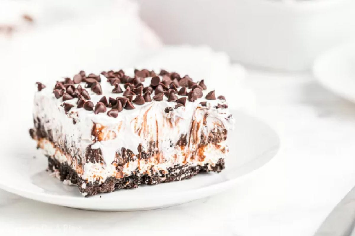 - Spread the remaining Cool Whip over the top. Sprinkle mini chocolate chips evenly over the top. Place in the freezer for 1 hour, or the refrigerator for 4 hours before serving.
