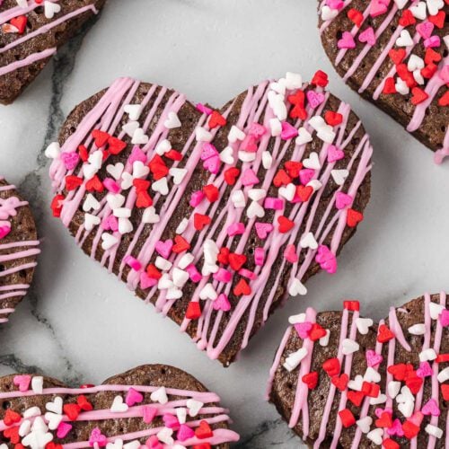 These Heart-Shaped Brownies are fudgy and perfect for Valentine’s Day. Each bite is packed with chocolate and topped with sprinkles.
