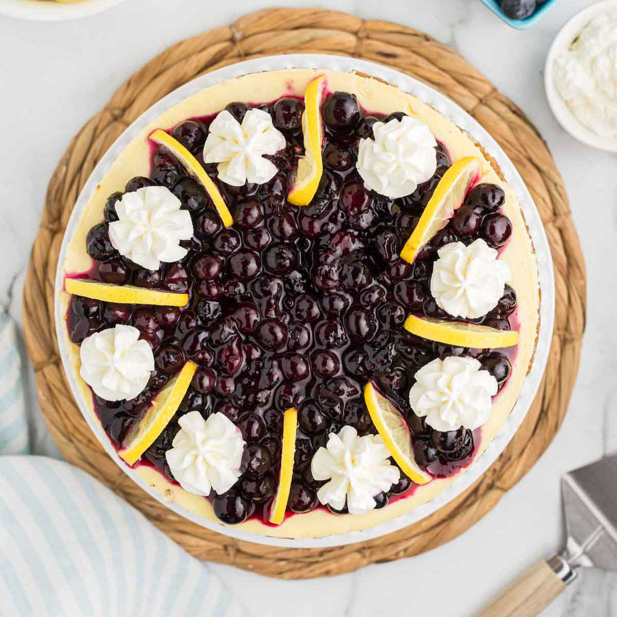 Step 9. When ready to serve, remove the cheesecake from the springform pan. Top with blueberry mixture, whipped cream and lemon slices.