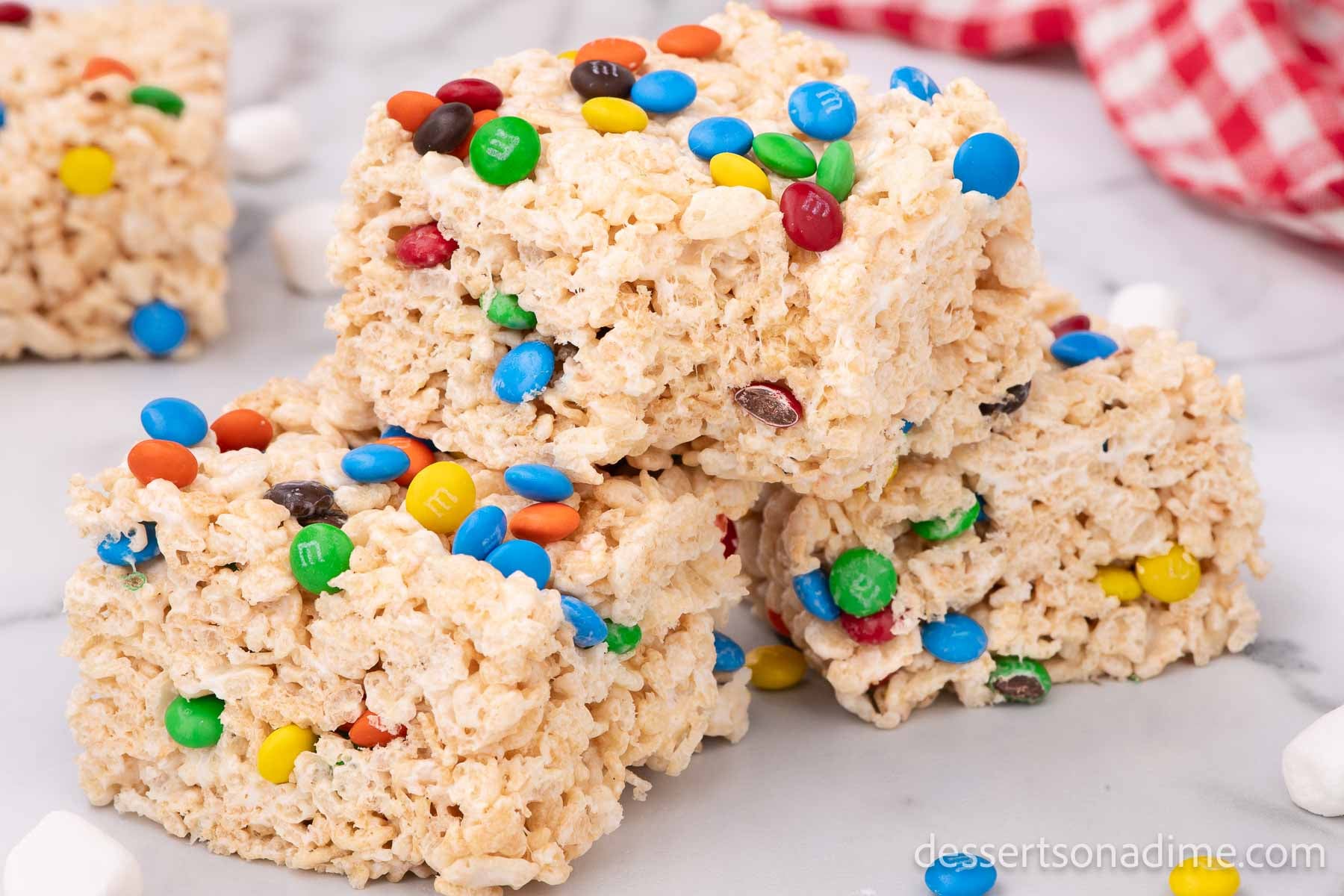Quick and easy M&M Rice Krispie Treats with marshmallows, cereal, and colorful M&M candies. Perfect for parties, snacks, and holiday treats.