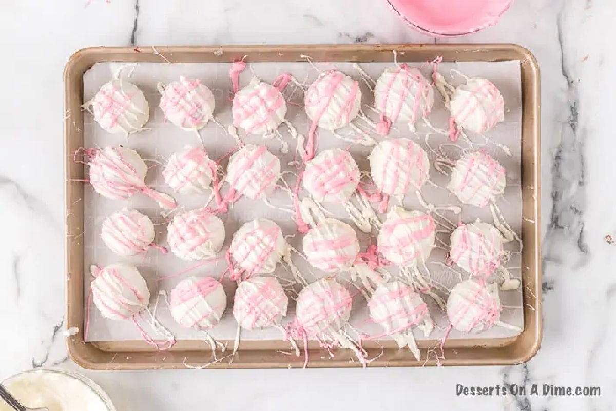 Step 9. Finally, melt the candy melts in a small microwavable bowl until smooth. Drizzle candy melts over the top of cake balls to decorate.