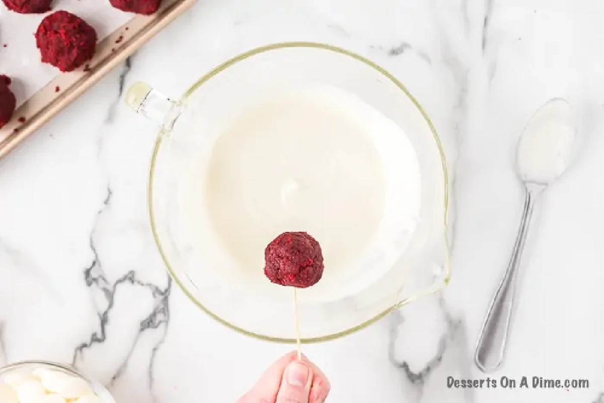 Step 7. Insert a toothpick into each cake pop. Dip the cake balls into melted white chocolate covering completely. Let any excess chocolate drip back into bowl.