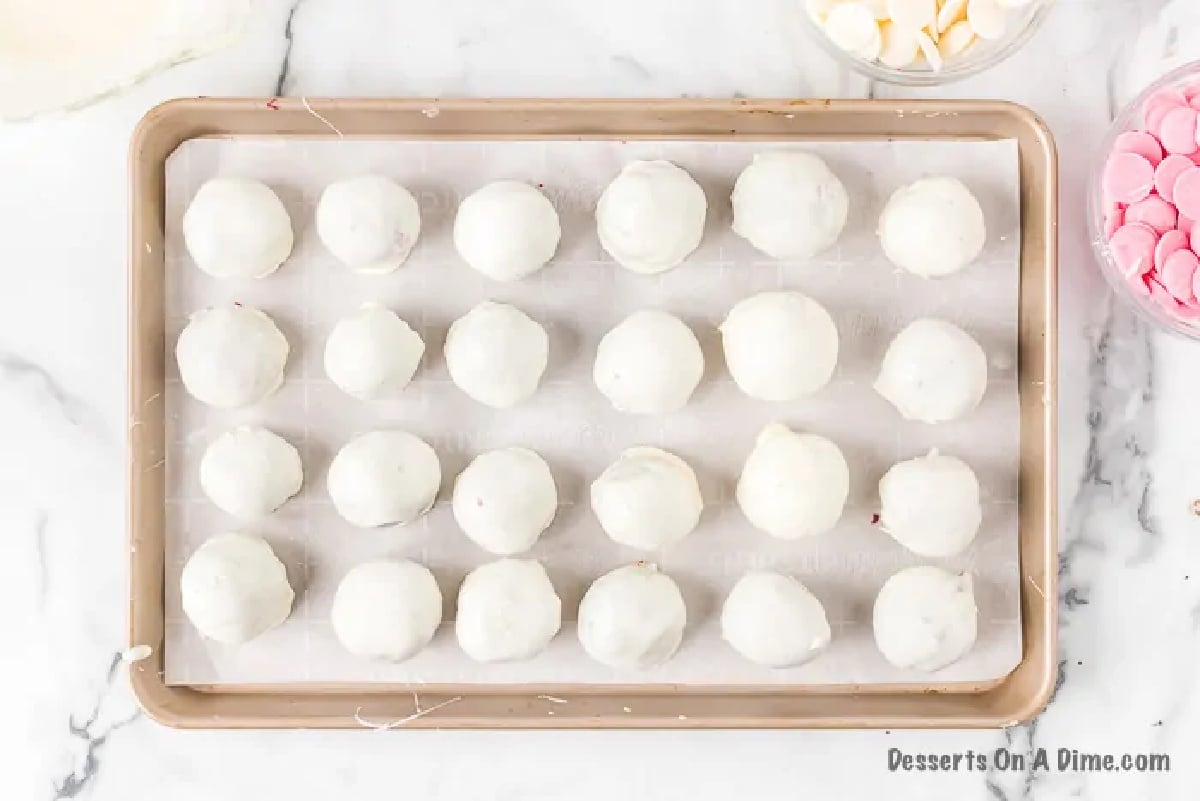 - Shape mixture into about 50 cake balls and place on a lined cookie sheet.